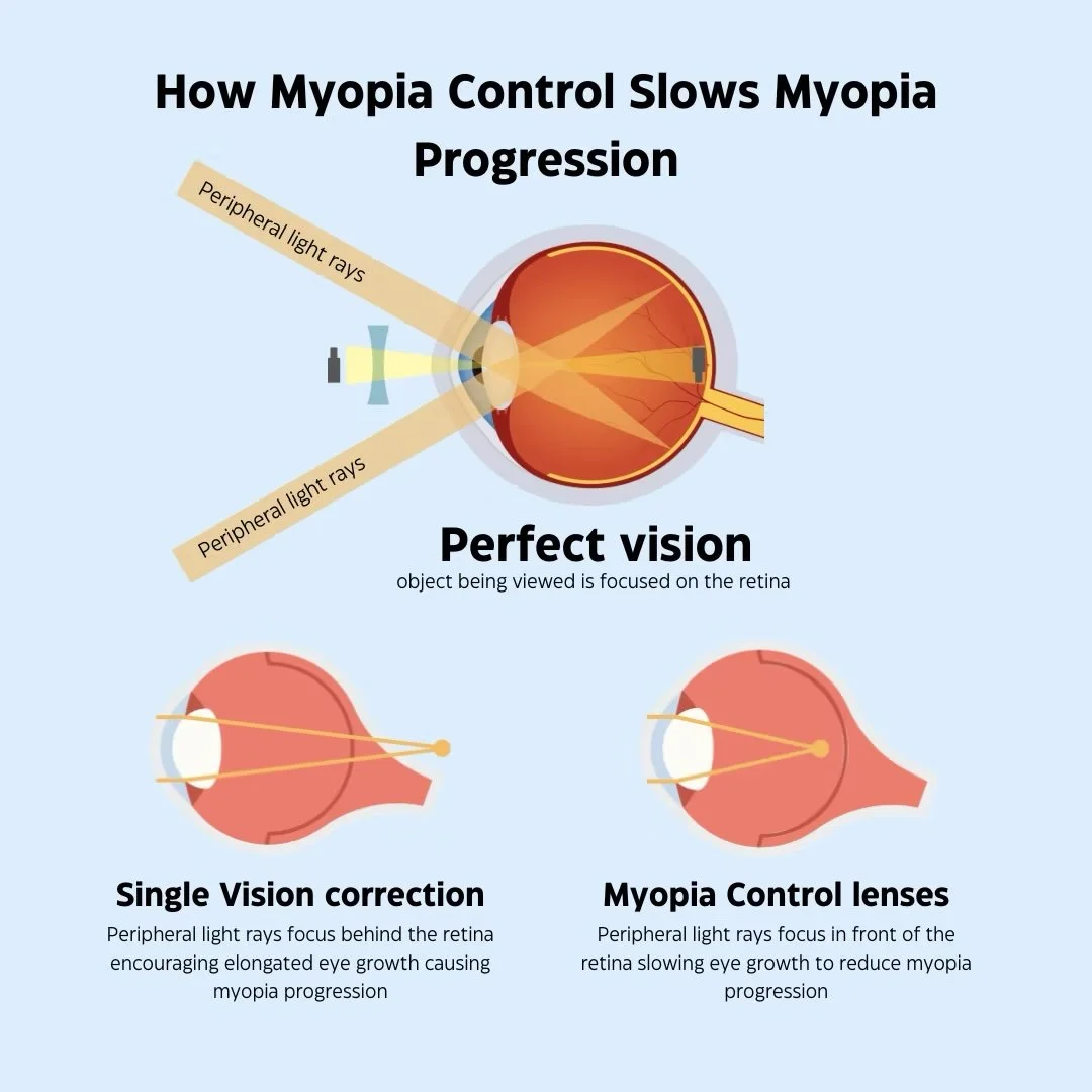 While these glasses lenses and other contact lens options are amazing ways to significantly slow progression of nearsightedness, there are also some simple things at home to keep in mind as other ways to keep our kid’s eyes from progressing. Studies show more time outdoors, taking breaks from screens and near work, and making sure they don’t hold material too close to their eyes are other tools to keep in mind in the effort to control myopia progression. Also, remember your annual eye exams are your best way to see if their eyes are on track or if there are any changes that need to be more closely monitored!