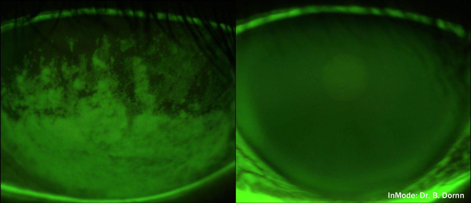 the tears on the left break up or dissipate easily in an uneven fashion. after treatment, tear film on the right is smooth creating clearer, more comfortable eyes and vision